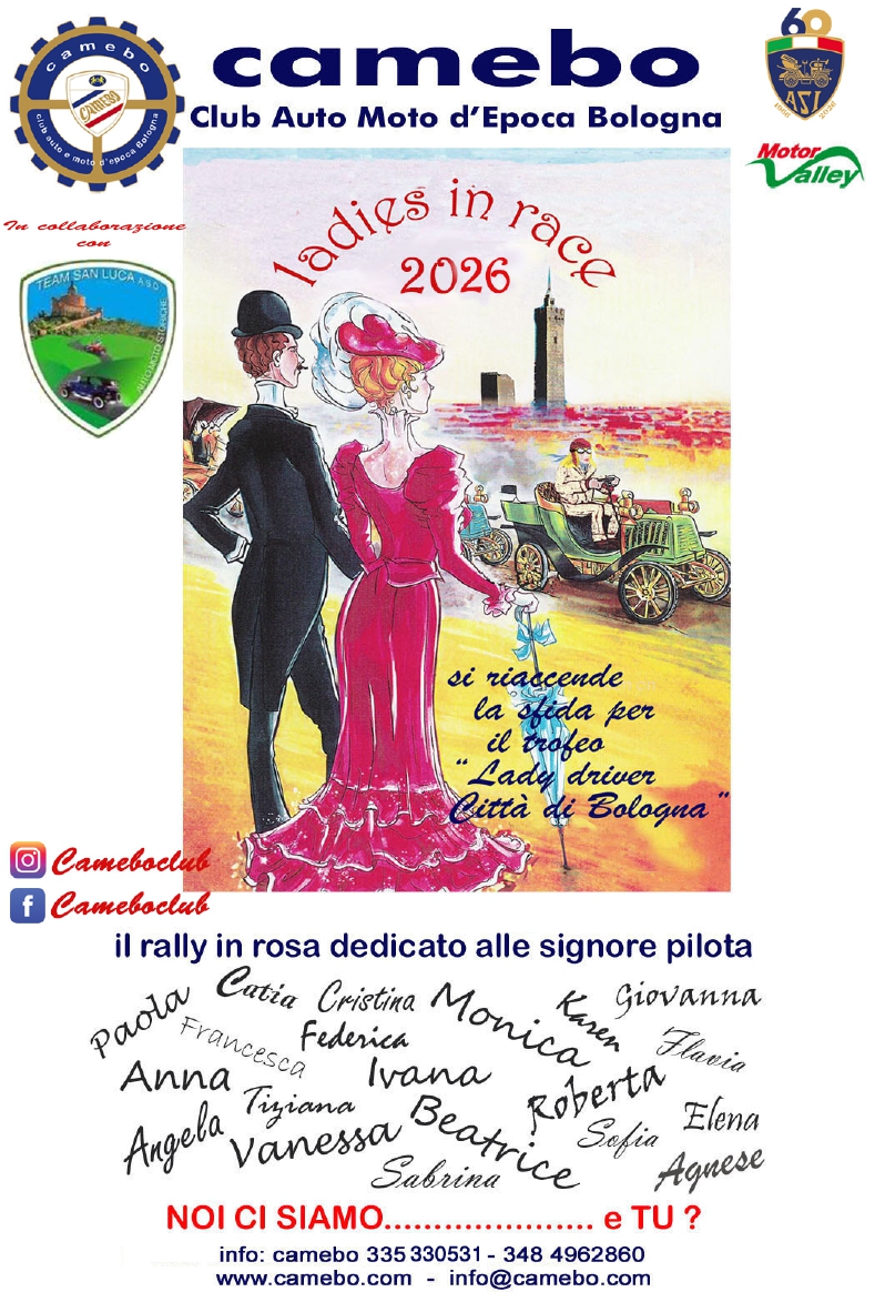 Tornano a ruggire i motori per il rally rosa di Camebo, una gara dedicata alle signore “pilota” appassionate di auto d’epoca e sportive che si svolge tra le “curve bolognesi” colorate dal primaverile verde dei colli e dal rosa dei ciliegi e dei Peschi in Fiore. Dal 2022 la gara farà parte di una Coppa Nazionale messa in Palio da ASI che andrà a premiare la miglior pilota in assoluto del circuito “Donne al Volante”.